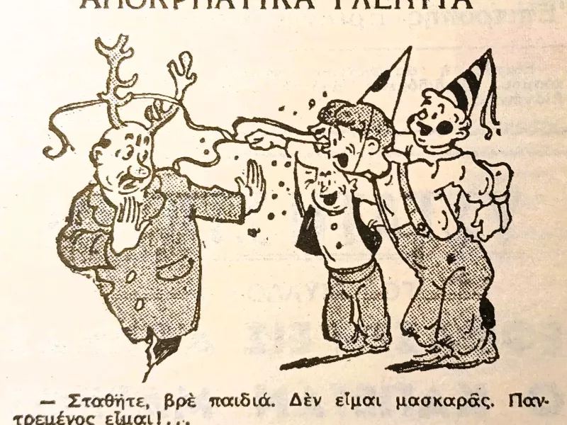 Το ευφυές πειραχτήρι της εποχής, ο χιουμορίστας πλακατζής Σουρής, κάθε Αποκριά μεταβάλλει το σπίτι του σε κέντρο διερχομένων με την προϋπόθεση ότι οι «διερχόμενοι» θα είναι μασκαράδες. Το ορθάνοιχτο κατώφλι του, λοιπόν, διαβαίνουν γνωστοί και άγνωστοι και υποβάλλουν τα σέβη τους στον οικοδεσπότη, προς αγωνίαν της οικοδέσποινας, που ανησυχεί για την ασφάλεια των αντικειμένων του σπιτιού... Ο γιος του ποιητή, Κρίτων Σουρής, θα γράψει: «ενώ υπήρχε τόση εξαιρετική ελευθερία εισόδου, γιατί ούτε ονόματα εζητούντο, ούτε ηξιούτο η αποβολή της μάσκας μέλους της συντροφιάς προς αναγνώρισιν, εντούτοις δεν συνέβη ποτέ ουδέ το ελάχιστον επεισόδιον. Νομίζει κανείς ότι και οι λωποδύται τον εσέβοντο, αφού ουδέποτε έλειψε το ελάχιστον αντικείμενον, αντιθέτως μάλιστα, εις μίαν Αποκριάν, μετά την αναχώρησιν και του τελευταίου μασκαρά, ευρέθη κρεμασμένο περισσεύον εν ημίψηλον!». Το «περίσσευμα» της γιορτής γίνεται αφορμή για τον έτερο χιουμορίστα, Καμπούρογλου, να δώσει τη δική του... μαύρη εξήγηση. Αυτές τις μέρες έχει αποκαλυφθεί ένα ειδεχθές έγκλημα στον Πειραιά, όπου σε εργαστήριο αρτοποιείου εντοπίζονται ακέφαλα πτώματα! «Σε κανένα από αυτά τα κεφάλια θ΄ ανήκει το καπέλο, που ξώμεινε στου Σουρή!» λέει ο Καμπούρογλου.