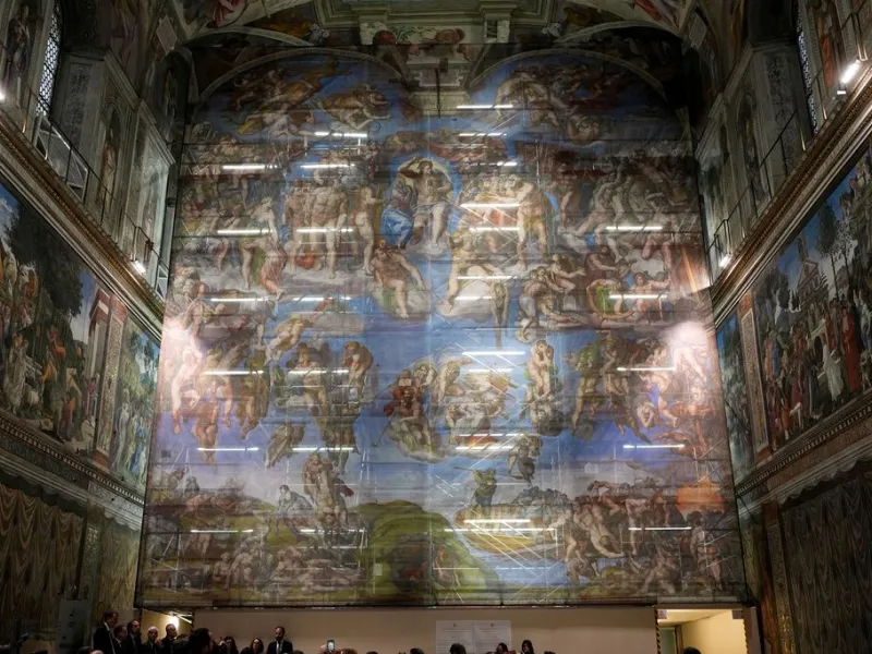 Το Βατικανό έδωσε το Σάββατο στα μέσα ενημέρωσης μια κλεφτή ματιά στην επιχείρηση καθαρισμού: Μία τεράστια οθόνη με αναπαράσταση της τοιχογραφίας του παραδείσου και της κόλασης, καλύπτει την τεράστια σκαλωσιά που έχει στηθεί από το δάπεδο μέχρι την οροφή.