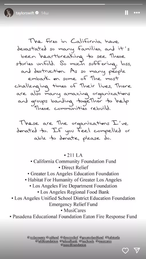 Η Τέιλορ Σουίφτ είναι από τους καλλιτέχνες που δεσμεύθηκαν να υποστηρίξουν τους πληγέντες από τις πυρκαγιές στο Λος Άντζελες.