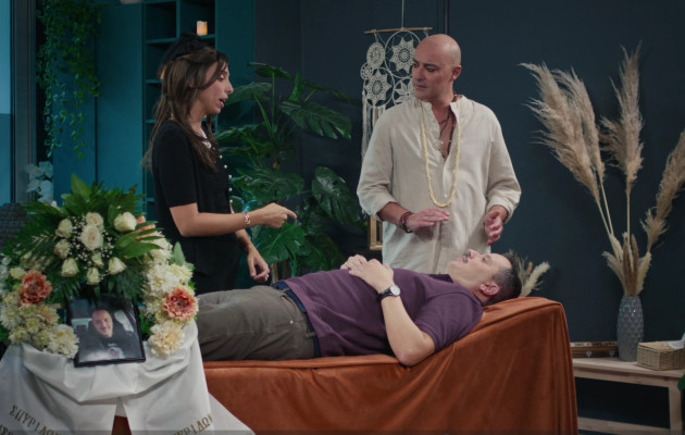 ΤΩΡΑ: Ο Σπύρος και η Βαλέρια έχουν επισκεφτεί έναν σύμβουλο γάμου, προκειμένου να λύσουν τα οικογενειακά τους προβλήματα. Οι μέθοδοι του συμβούλου είναι αντισυμβατικοί και σε μία απ’ αυτές, ο Σπύρος πρέπει να παριστάνει τον νεκρό, όσο η Βαλέρια, πλήρως απελευθερωμένη θα μοιράζεται τα συναισθήματά της.