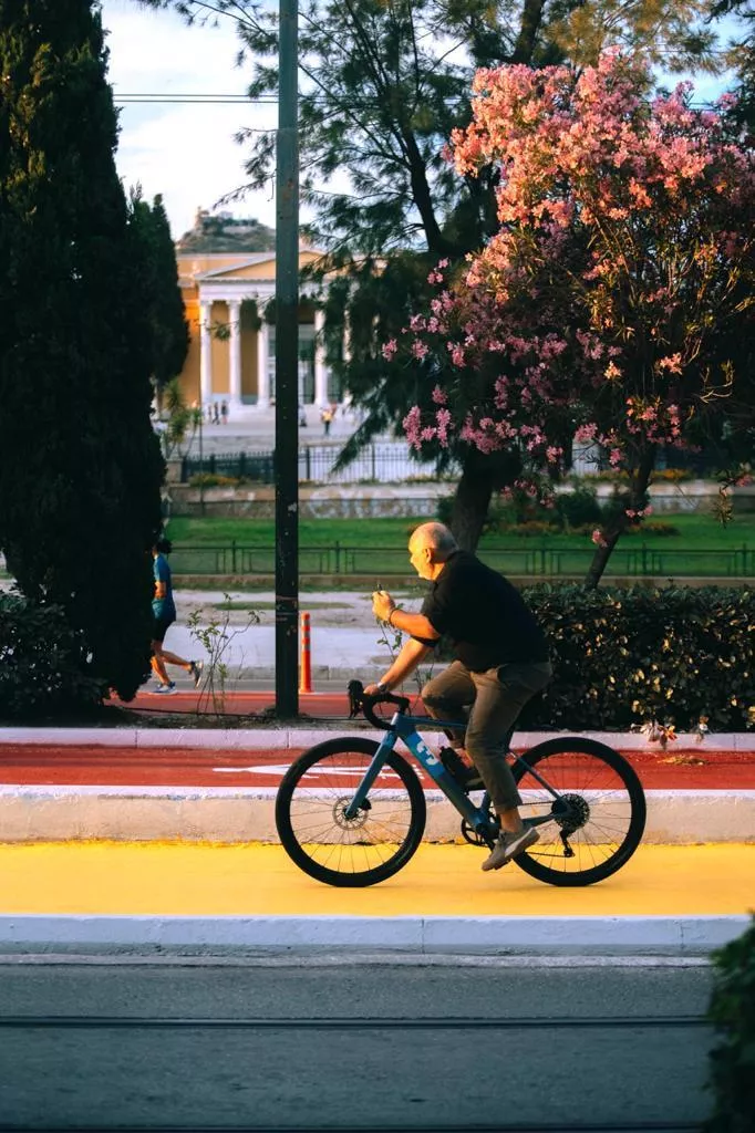 Δίπλα στον πεζόδρομο, εκεί που περνούν οι γραμμές του τραμ, δημιουργήθηκε μια προσωρινή διαδρομή για ποδήλατο, σε κίτρινο χρώμα με αντανακλαστικές και αντιολισθητικές βαφές. Μια διαδρομή που φτιάχτηκε από τον Δήμο Αθηναίων αξιοποιώντας το γεγονός ότι το τραμ έχει διακόψει στο σημείο αυτό τα δρομολόγια του, για να διευκολύνει τους ποδηλάτες να φτάσουν ως τον υπερσύγχρονο ποδηλατόδρομο που δημιουργείται στην Πανεπιστημίου. Η προσωρινή αυτή διαδρομή θα υπάρχει μέχρι να τεθεί ξανά σε λειτουργία το τραμ ως το κέντρο της πόλης, κάτι που αποτελεί επιθυμία όλων, καθώς εξυπηρετεί χιλιάδες ανθρώπους και δένει αρμονικά με το περιβάλλον που δημιουργεί ο Μεγάλος Περίπατος.