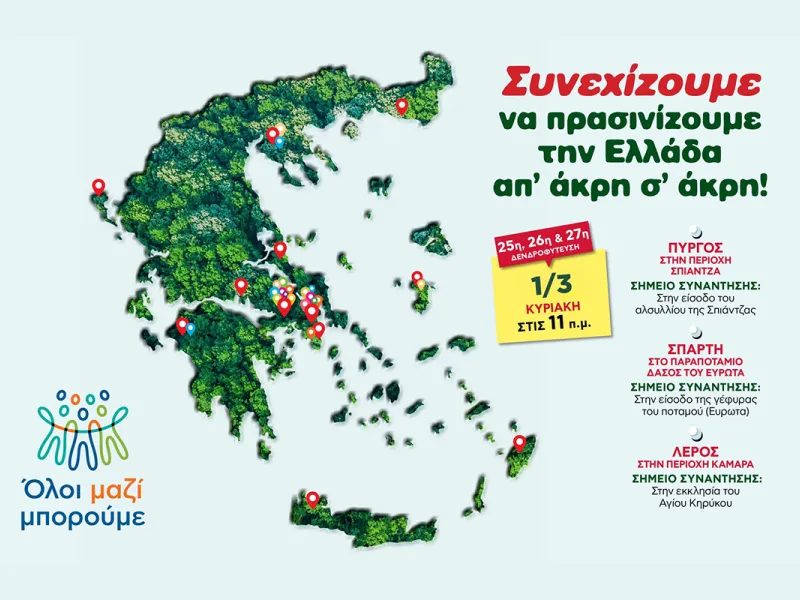 Και φέτος, συνεχίζουμε να πρασινίζουμε την Ελλάδα από άκρη σε άκρη! Αυτή την Κυριακή 1 Μαρτίου, έχουμε τριπλή δενδροφύτευση σε Πύργο, Σπάρτη και Λέρο.