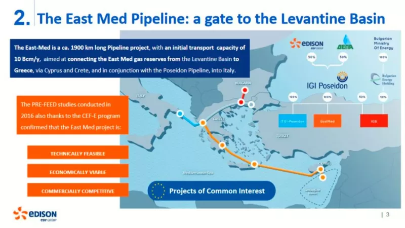 Ο αγωγός East Mediterranean ή απλώς EastMed θα ενώσει τα ενεργειακά αποθέματα της ανατολικής Μεσογείου μέσω της Κύπρου με την Ελλάδα και την Ιταλία. Ο αγωγός θα εκτείνεται σε 1.900 χλμ και υπολογίζεται ότι θα μεταφέρει ετησίως έως 10 δισ. κυβικά μέτρα φυσικού αερίου από τα αποθέματα της Θάλασσας του Λεβάντε του Ισραήλ στην Ε.Ε., η οποία συγχρηματοδοτεί το έργο. Συνολικά το σχέδιο για τον αγωγό προβλέπεται να στοιχίσει 5,9 δισ. δολάρια.