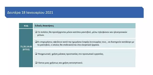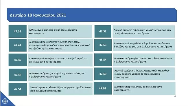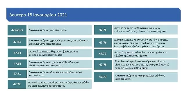 Aναλυτικά τα καταστήματα που ανοίγουν από Δευτέρα 18 Ιανουαρίου, μπορούν εάν το επιθυμούν τα λειτουργούν από τις 07:00 π.μ έως 20:00 μ.μ: