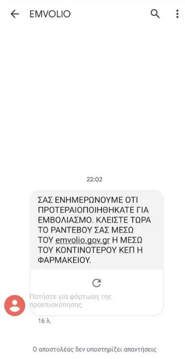 Από τις 21.30 της Μεγάλης Δευτέρας ξεκίνησαν να φτάνουν στα κινητά των πολιτών που ανήκουν στην εν λόγω κατηγορία και είναι εγγεγραμμένοι στην άυλη συνταγογράφηση, τα πρώτα ενημερωτικά SMS με το μήνυμα: «Σας ενημερώνουμε ότι προτεραιοποιηθήκατε για εμβολιασμό. Κλείστε τώρα το ραντεβού σας μέσω του emvolio.gov.gr ή μέσω του κοντινότερου ΚΕΠ ή φαρμακείου».