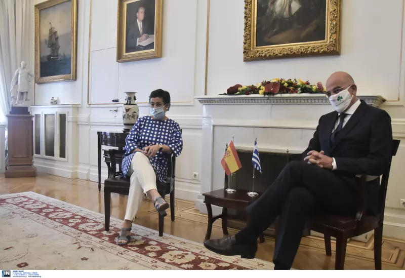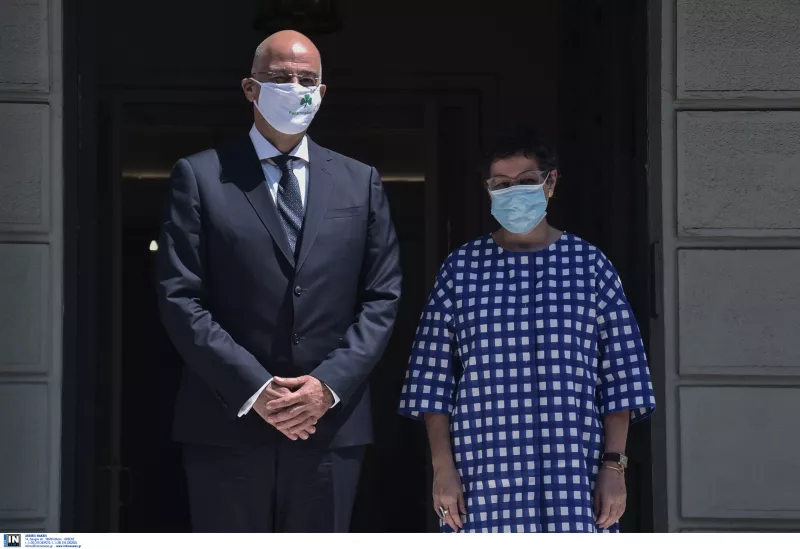 Ο Νίκος Δένδιας υποδέχτηκε την Ισπανίδα ομόλογό του Αράντσα Γκονθάλεθ Λάγια φορώντας τη συγκεκριμένη μάσκα, κάτι που δεν διέφυγε της προσοχής της κ. Λάγια.