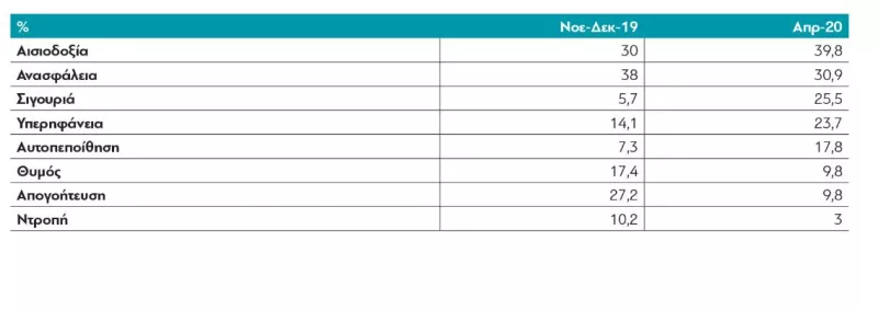 Στην ερώτηση για το ποιο είναι το κυρίαρχο συναίσθημά τους, το 40% των ερωτηθέντων ανάφεραν την “αισιοδοξία” (από 30% πέντε μήνες πριν) ενώ 31% επέλεξαν την ανασφάλεια (από 38% τον Δεκέμβριο). Σήμερα πενταπλάσιοι από τότε δηλώνουν ότι νιώθουν σιγουριά, υπερδιπλάσιοι ότι νιώθουν αυτοπεποίθηση. Σχεδόν οι μισοί δηλώνουν το θυμό. Μόνο το ένα τρίτο δηλώνουν σήμερα την απογοήτευση.