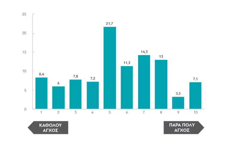Άλλα αποτελέσματα έδειξαν πως ένας ένας στους δέκα Έλληνες (10,9%) δηλώνουν ότι περνούν την περίοδο της καραντίνας μόνοι (19,3% στους ηλικιωμένους), ενώ το μέσο άγχος στην κλίμακα 1-10 μετρήθηκε στο 5,5.