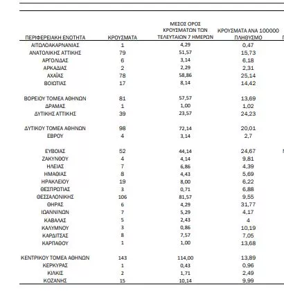 Την ίδια ώρα εκρηκτική αύξηση βλέπουμε πλέον και στη Θεσσαλονίκη με 106 νέα κρούσματα ενώ μια ανάσα πριν τον τριψήφιο αριθμό ασθενών είναι και η Αχαία με 78 μολύνσεις.