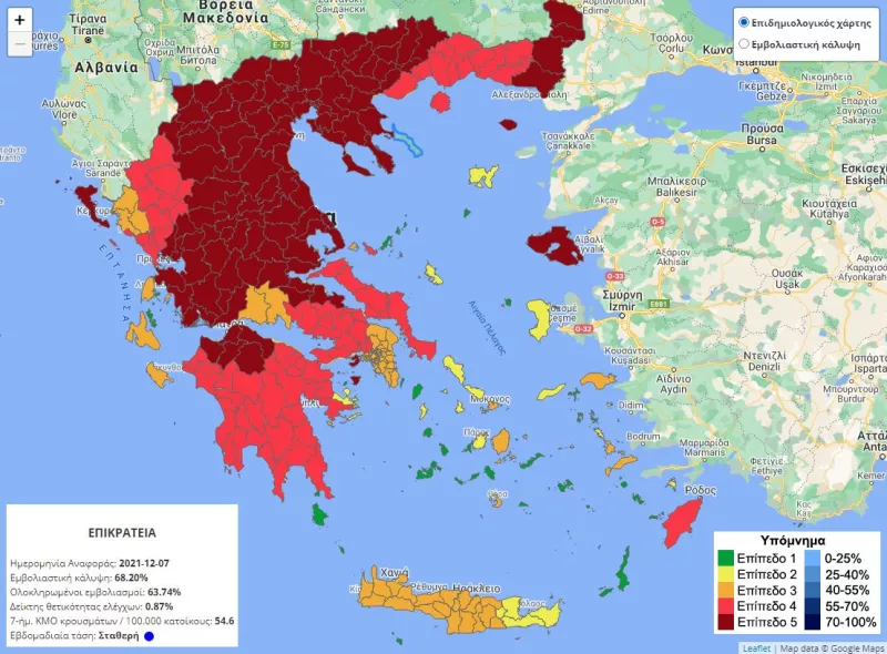 Ακόμη μία περιφέρεια της χώρας μπαίνει αυτή την εβδομάδα στο βαθύ κόκκινο (επίπεδο 5) του Επιδημιολογικού Χάρτη, ενώ μία περιφέρεια περνά από το κίτρινο (επίπεδο 2) στο πορτοκαλί (επίπεδο 3), καθώς παρουσίασε νέα επιδείνωση στους επιδημιολογικούς δείκτες.