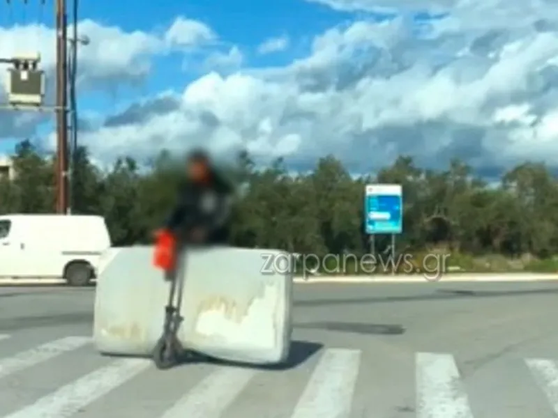Σε μια επικίνδυνη «αποστολή» επιδόθηκε ένας οδηγός στα Χανιά, μεταφέροντας με το πατίνι του ένα στρώμα.