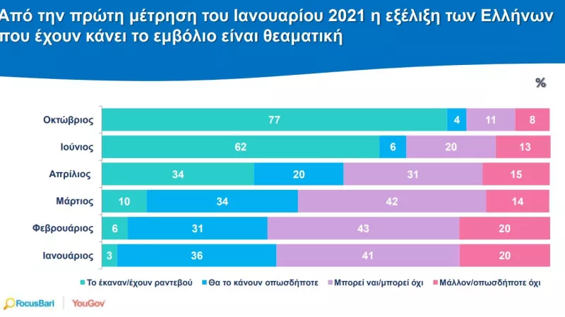Το ποσοστό των "αρνητών" εμφανίζει διαχρονική υποχώρηση από 20% κατά το δίμηνο Ιανουαρίου-Φεβρουαρίου 2021, σε 15% τον Απρίλιο, 13% τον Ιούνιο και 8% τον Οκτώβριο. Αντίστοιχα, έχει συρρικνωθεί το ποσοστό των διστακτικών από 43% τον Φεβρουάριο, σε 31% τον Απρίλιο, 20% τον Ιούνιο και 8% τον Οκτώβριο.