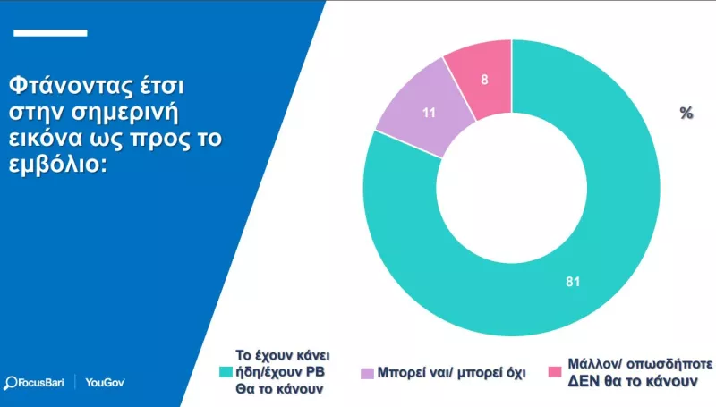 Σύμφωνα με τη δειγματοληπτική έρευνα, το 77% δηλώνουν ότι έχουν κάνει ήδη το εμβόλιο ή έχουν ήδη κλείσει ραντεβού και το 4% ότι θα το κάνουν οπωσδήποτε. Η αναλογία αυτή είναι πολύ υψηλότερη από την αντίστοιχη που παρατηρήθηκε τον Ιούνιο 2021 (62%). Η Ελλάδα παραμένει ωστόσο μεταξύ των χωρών με την χαμηλότερη αναλογία εμβολιασμένων, σύμφωνα με τη Focus Bari | YouGov.