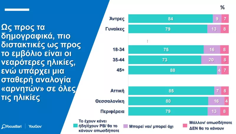 Οι γυναίκες εμφανίζονται πιο διστακτικές (13%) από ό,τι οι άνδρες (9%) και ελαφρώς πιο αρνητικές (8% έναντι 7%). Το ποσοστό αρνητών και διστακτικών είναι μεγαλύτερο στη Θεσσαλονίκη (20%) σε σχέση με την Αττική (15%).