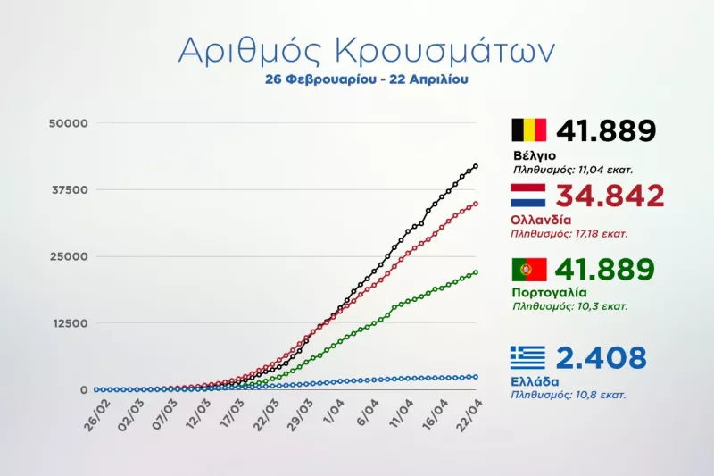 Πρόκειται για το διάστημα 26 Φεβρουαρίου με 22 Απριλίου. Η Ελλάδα είναι χαμηλότερη στην κατάταξη των κρουσμάτων του κορωνοιού με 2.408 κρούσματα συγκριτικά με άλλες χώρες .