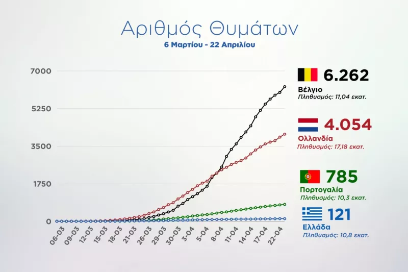 Σε αντίστοιχο πίνακα για τα θύματα από 6 Μαρτίου μέχρι τις 22 Απριλίου η Ελλάδα πάλι βρίσκεται σε χαμηλότερη θέση με 121 θύματα από τον κορωνοιό, η Πορτογαλία με 785, η Ολλανδία με 4.054 και το Βέλγιο μετράει 6.262 θανάτους από τον επικίνδυνο αυτόν ιό.