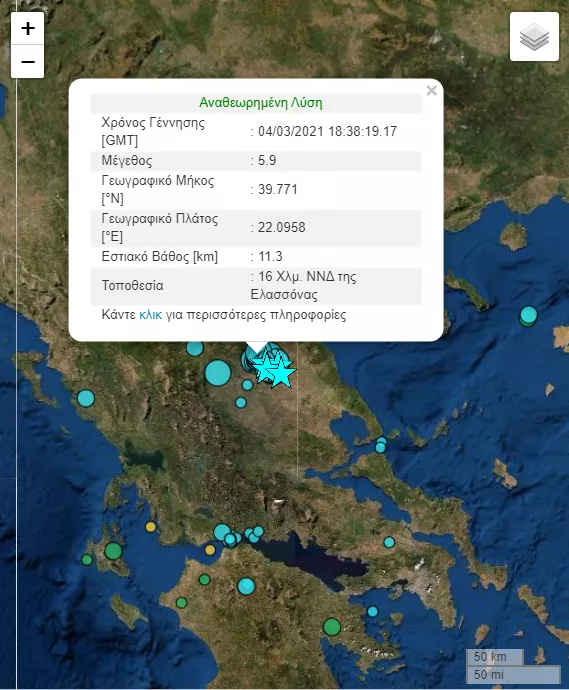 Ισχυρός μετασεισμός μεγέθους 5,9 βαθμών της Κλίμακας Ρίχτερ σημειώθηκε στις 20.38, 16 χιλιόμετρα νότια νοτιοδυτικά της Ελασσόνας, σύμφωνα με την αναθεωρημένη λύση του Γεωδυναμικού Ινστιτούτου. Το εστιακό βάθος του σεισμού, εντοπίζεται στα 11,3 χιλιόμετρα.