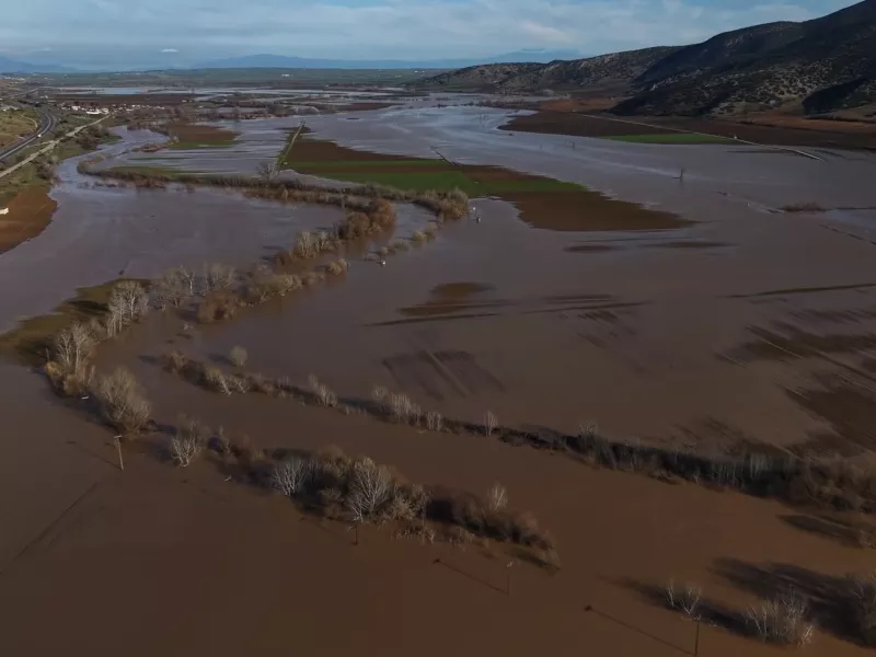 Οι εναέριες εικόνες που κατέγραψε το drone του Orange Press Agency είναι αποκαλυπτικές του μεγέθους της καταστροφής. Στην περιοχή που εκτείνεται από την Πηνειάδα προς το Κουτσόχερο, ο ποταμός βγήκε από την κοίτη του, δημιουργώντας μια «καφέ θάλασσα» που έχει απλωθεί ανεξέλεγκτα, καλύπτοντας χιλιάδες στρέμματα γης.