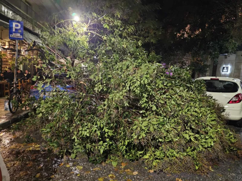 Από τις πτώσεις των δέντρων προκλήθηκαν ζημιές σε σταθμευμένα αυτοκίνητα.