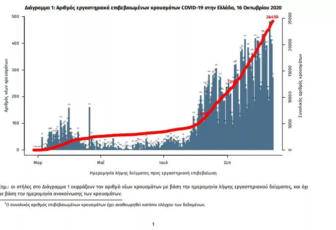 Τα στοιχεία που παρουσιάζονται αφορούν περιστατικά από την επιδημιολογική επιτήρηση της νόσου από το νέο κορωνοϊό (COVID19), με βάση τα δεδομένα που έχουν δηλωθεί στον ΕΟΔΥ και καταγραφεί μέχρι τις 16 Οκτωβρίου 2020 (ώρα 15:00). Τα νέα εργαστηριακά επιβεβαιωμένα κρούσματα της νόσου είναι 508, εκ των οποίων 64 συνδέονται με γνωστές συρροές και 12 εντοπίστηκαν κατόπιν ελέγχων στις πύλες εισόδου της χώρας. Ο συνολικός αριθμός των κρουσμάτων ανέρχεται σε 24450 (ημερήσια μεταβολή +2.1%), εκ των οποίων 55.6% άνδρες.