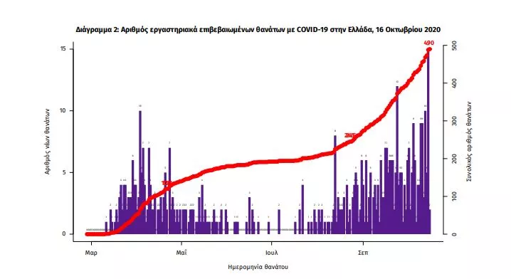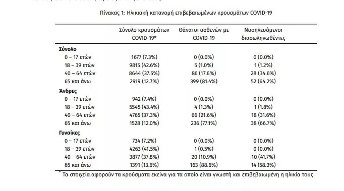 Τέλος, έχουμε 8 ακόμα καταγεγραμμένους θανάτους και 490 θανάτους συνολικά στη χώρα. 184 (37.6%) γυναίκες και οι υπόλοιποι άνδρες. Η διάμεση ηλικία των θανόντων συμπολιτών μας ήταν τα 79 έτη και το 96.3% είχε κάποιο υποκείμενο νόσημα ή/και ηλικία 70 ετών και άνω.