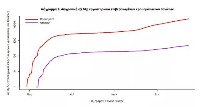 Η διαχρονική εξέλιξη των συνολικών κρουσμάτων και συνολικού αριθμού των θανάτων ασθενών COVID-19 παρουσιάζεται στο ακόλουθο διάγραμμα (σε λογαριθμική κλίμακα).