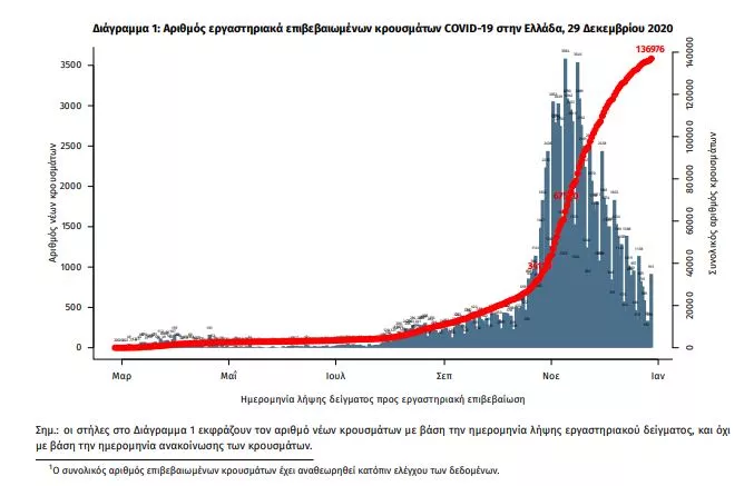 Τα στοιχεία που παρουσιάζονται αφορούν περιστατικά από την επιδημιολογική επιτήρηση της νόσου από το νέο κορωνοϊό (COVID19), με βάση τα δεδομένα που έχουν δηλωθεί στον ΕΟΔΥ και καταγραφεί μέχρι τις 29 Δεκεμβρίου 2020 (ώρα 15:00). Τα νέα εργαστηριακά επιβεβαιωμένα κρούσματα της νόσου είναι 1047, εκ των οποίων 16 εντοπίστηκαν κατόπιν ελέγχων στις πύλες εισόδου της χώρας. Ο συνολικός αριθμός των κρουσμάτων ανέρχεται σε 136976 (ημερήσια μεταβολή +0.8%), εκ των οποίων 52.3% άνδρες. 1 Οι νέοι θάνατοι ασθενών με COVID-19 είναι 58, ενώ από την έναρξη της επιδημίας έχουν καταγραφεί συνολικά 4730 θάνατοι.Η διάμεση ηλικία των ασθενών που απεβίωσαν είναι 79 έτη. Ο αριθμός των ασθενών που νοσηλεύονται διασωληνωμένοι είναι 458 (69.4% άνδρες). Η ημερήσια κατανομή των επιβεβαιωμένων κρουσμάτων είναι η ακόλουθη (η γραμμή παριστάνει την συνολική, αθροιστική κατανομή των κρουσμάτων).