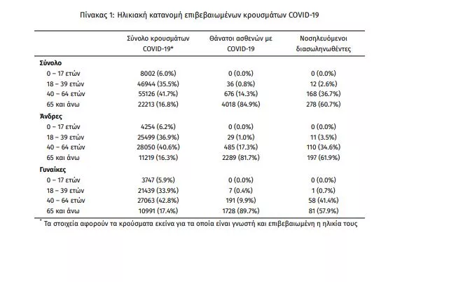 Η διάμεση ηλικία των κρουσμάτων είναι 44 έτη (εύρος 0.2 έως 104 ετών), ενώ η διάμεση ηλικία των θανάτων είναι 79 έτη (εύρος 24 έως 103 ετών). Η ηλικιακή κατανομή των (α) συνολικών κρουσμάτων, (β) των περιστατικών που κατέληξαν σε θάνατο και (γ) των ασθενών που νοσηλεύονται διασωληνωμένοι, είναι η ακόλουθη:
