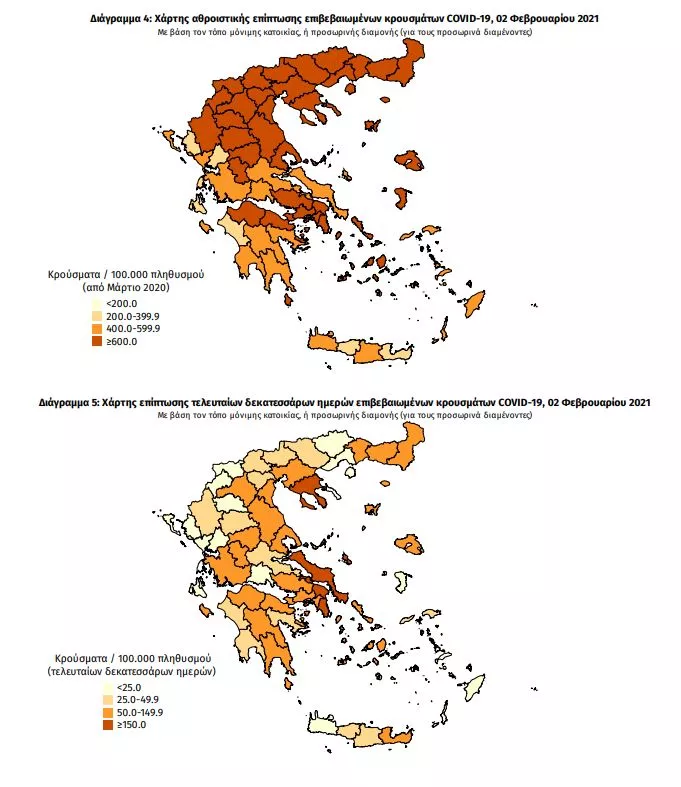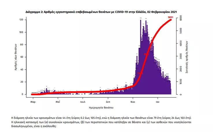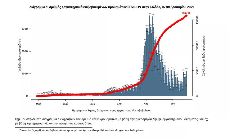 Τα στοιχεία που παρουσιάζονται αφορούν περιστατικά από την επιδημιολογική επιτήρηση της νόσου από το νέο κορωνοϊό (COVID19), με βάση τα δεδομένα που έχουν δηλωθεί στον ΕΟΔΥ και καταγραφεί μέχρι τις 02 Φεβρουαρίου 2021 (ώρα 15:00). Τα νέα εργαστηριακά επιβεβαιωμένα κρούσματα της νόσου είναι 1261, εκ των οποίων 18 εντοπίστηκαν κατόπιν ελέγχων στις πύλες εισόδου της χώρας. Ο συνολικός αριθμός των κρουσμάτων ανέρχεται σε 158716 (ημερήσια μεταβολή +0.8%), εκ των οποίων 52.0% άνδρες. 1 Οι νέοι θάνατοι ασθενών με COVID-19 είναι 22, ενώ από την έναρξη της επιδημίας έχουν καταγραφεί συνολικά 5851 θάνατοι. Η διάμεση ηλικία των ασθενών που απεβίωσαν είναι 79 έτη. Ο αριθμός των ασθενών που νοσηλεύονται διασωληνωμένοι είναι 244 (73.0% άνδρες). Η ημερήσια κατανομή των επιβεβαιωμένων κρουσμάτων είναι η ακόλουθη (η γραμμή παριστάνει την συνολική, αθροιστική κατανομή των κρουσμάτων).