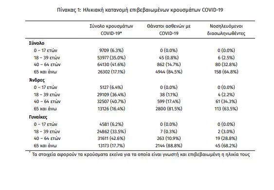 Τέλος, έχουμε 22 νέους θανάτους από τη νόσο COVID-19, φθάνοντας τους 5851 θανάτους συνολικά στη χώρα, εκ των οποίων 3437 (58.7%) άνδρες. Η διάμεση ηλικία των θανόντων συμπολιτών μας ήταν τα 79 έτη και το 95.5% είχε κάποιο υποκείμενο νόσημα ή/και ηλικία 70 ετών και άνω.
