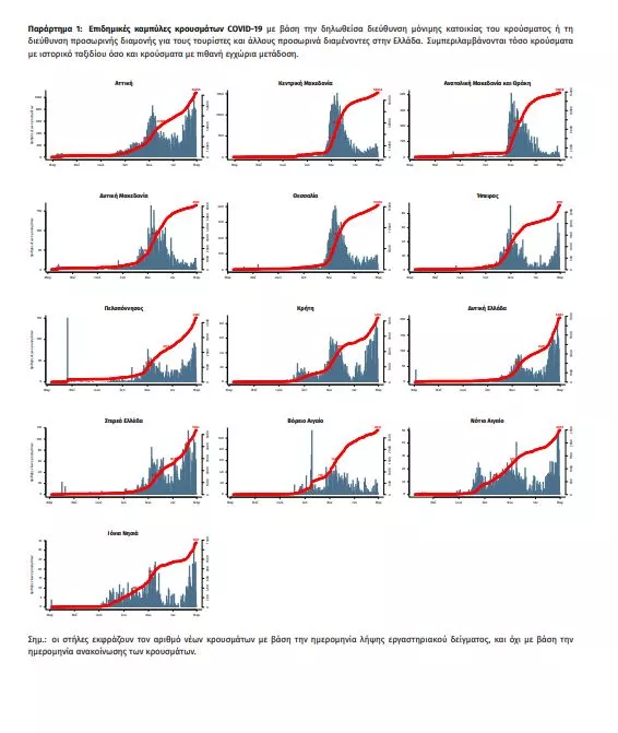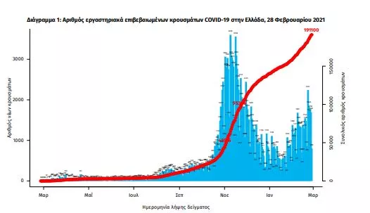 Η ημερήσια κατανομή των επιβεβαιωμένων κρουσμάτων είναι η ακόλουθη (η γραμμή παριστάνει την συνολική, αθροιστική κατανομή των κρουσμάτων).
