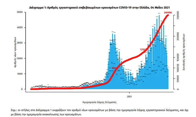 Τα νέα εργαστηριακά επιβεβαιωμένα κρούσματα της νόσου που καταγράφηκαν τις τελευταίες 24 ώρες είναι 1.387, εκ των οποίων 2 εντοπίστηκαν κατόπιν ελέγχων στις πύλες εισόδου της χώρας. Ο συνολικός αριθμός των κρουσμάτων ανέρχεται σε 349.936 (ημερήσια μεταβολή +0.4%), εκ των οποίων 51.3% άνδρες.