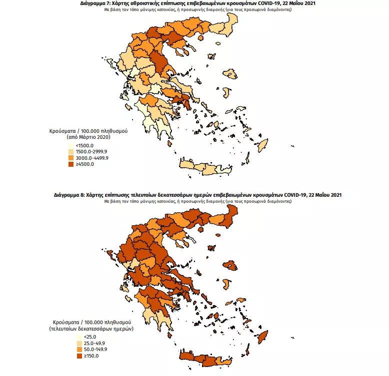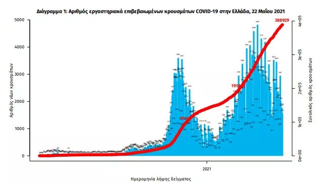 Τα στοιχεία που παρουσιάζονται αφορούν περιστατικά από την επιδημιολογική επιτήρηση της νόσου από το νέο κορωνοϊό (COVID19), με βάση τα δεδομένα που έχουν δηλωθεί στον ΕΟΔΥ και καταγραφεί μέχρι τις 22 Μαΐου 2021 (ώρα 15:00).