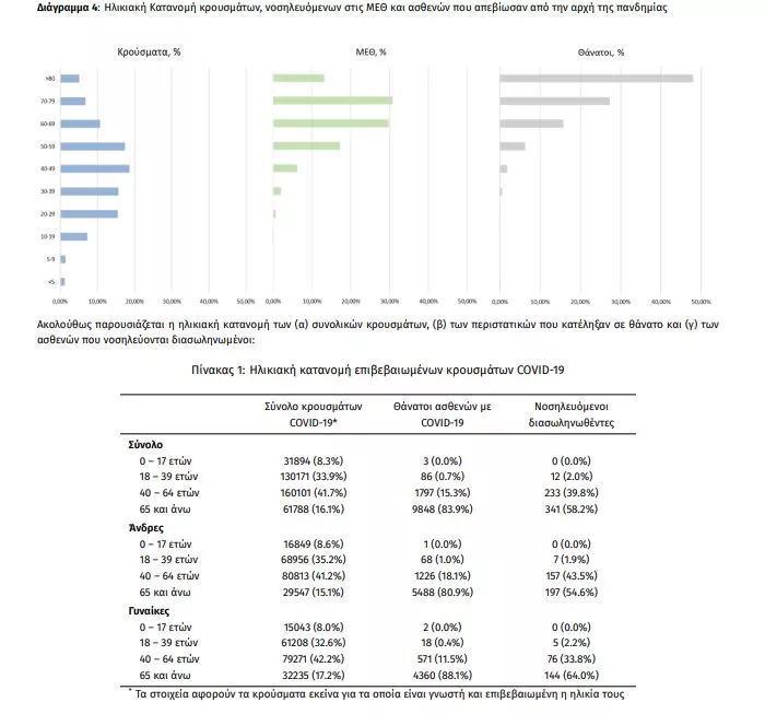 Ο αριθμός των ασθενών που νοσηλεύονται διασωληνωμένοι είναι 586 (61.9% άνδρες). Η διάμεση ηλικία τους είναι 67 έτη. To 83.6% έχει υποκείμενο νόσημα ή/και ηλικία 70 ετών και άνω. Από την αρχή της πανδημίας έχουν εξέλθει από τις ΜΕΘ 2.342 ασθενείς. Οι εισαγωγές2 νέων ασθενών Covid-19 στα νοσοκομεία της επικράτειας είναι 267 (ημερήσια μεταβολή +2.69%). Ο μέσος όρος εισαγωγών του επταημέρου είναι 295 ασθενείς. Η διάμεση ηλικία των κρουσμάτων είναι 44 έτη (εύρος 0.2 έως 106 έτη), ενώ η διάμεση ηλικία των θανόντων είναι 78 έτη (εύρος 0.2 έως 106 έτη).