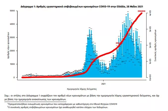 Τα στοιχεία που παρουσιάζονται αφορούν περιστατικά από την επιδημιολογική επιτήρηση της νόσου από το νέο κορωνοϊό (COVID19), με βάση τα δεδομένα που έχουν δηλωθεί στον ΕΟΔΥ και καταγραφεί μέχρι τις 28 Μαΐου 2021 (ώρα 15:00). Τα νέα εργαστηριακά επιβεβαιωμένα κρούσματα της νόσου που καταγράφηκαν τις τελευταίες 24 ώρες είναι 1.585, εκ των οποίων 6 εντοπίστηκαν κατόπιν ελέγχων στις πύλες εισόδου της χώρας. Ο συνολικός αριθμός των κρουσμάτων ανέρχεται σε 398.898 (ημερήσια μεταβολή +0.5%), εκ των οποίων 51.2% άνδρες.’ Με βάση τα επιβεβαιωμένα κρούσματα των τελευταίων 7 ημερών, 28 θεωρούνται σχετιζόμενα με ταξίδι από το εξωτερικό και 2.102 είναι σχετιζόμενα με ήδη γνωστό κρούσμα.