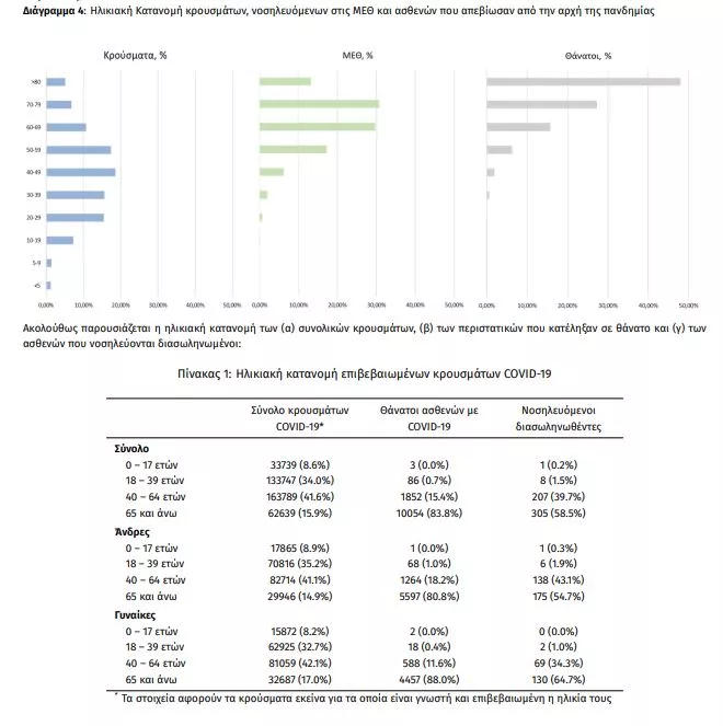Ο αριθμός των ασθενών που νοσηλεύονται διασωληνωμένοι είναι 521 (61.8% άνδρες). Η διάμεση ηλικία τους είναι 67 έτη. To 85.6% έχει υποκείμενο νόσημα ή/και ηλικία 70 ετών και άνω. Από την αρχή της πανδημίας έχουν εξέλθει από τις ΜΕΘ 2.411 ασθενείς. Οι εισαγωγές3 νέων ασθενών Covid-19 στα νοσοκομεία της επικράτειας είναι 231 (ημερήσια μεταβολή +12.14%). Ο μέσος όρος εισαγωγών του επταημέρου είναι 227 ασθενείς.Η διάμεση ηλικία των κρουσμάτων είναι 44 έτη (εύρος 0.2 έως 106 έτη), ενώ η διάμεση ηλικία των θανόντων είναι 78 έτη (εύρος 0.2 έως 106 έτη).