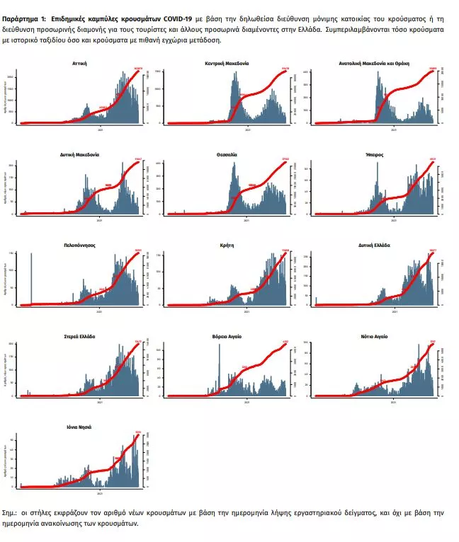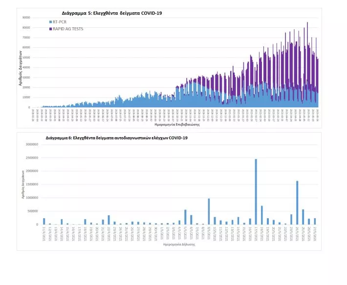 Δείγματα που έχουν ελεγχθεί: Από την 1η Ιανουαρίου 2020 μέχρι σήμερα, στα εργαστήρια που διενεργούν ελέγχους για τον νέο κορωνοϊό (SARS-CoV-2) και που δηλώνουν συστηματικά το σύνολο των δειγμάτων που ελέγχουν, έχουν συνολικά ελεγχθεί 5.043.871 κλινικά δείγματα ενώ από Μονάδες Υγείας και Κλιμάκια του ΕΟΔΥ που διενεργούν ελέγχους Rapid Ag έχουν ελεγχθεί 4.383.466 δείγματα. O μέσος όρος του επταημέρου είναι 44.987 δειγματοληπτικοί έλεγχοι.