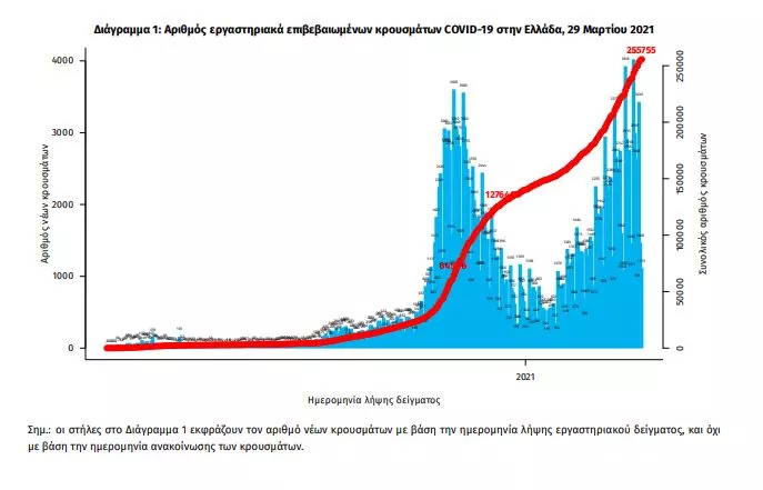Τα στοιχεία που παρουσιάζονται αφορούν περιστατικά από την επιδημιολογική επιτήρηση της νόσου από το νέο κορωνοϊό (COVID19), με βάση τα δεδομένα που έχουν δηλωθεί στον ΕΟΔΥ και καταγραφεί μέχρι τις 29 Μαρτίου 2021 (ώρα 15:00). Τα νέα εργαστηριακά επιβεβαιωμένα κρούσματα της νόσου που καταγράφηκαν τις τελευταίες 24 ώρες είναι 1.724, εκ των οποίων 22 εντοπίστηκαν κατόπιν ελέγχων στις πύλες εισόδου της χώρας. Ο συνολικός αριθμός των κρουσμάτων ανέρχεται σε 255.755 (ημερήσια μεταβολή +0.7%), εκ των οποίων 51.5% άνδρες. Με βάση τα επιβεβαιωμένα κρούσματα των τελευταίων 7 ημερών, 72 θεωρούνται σχετιζόμενα με ταξίδι από το εξωτερικό και 2.162 είναι σχετιζόμενα με ήδη γνωστό κρούσμα. Ημερήσια εξέλιξη της πανδημίας: Η ημερήσια κατανομή των επιβεβαιωμένων κρουσμάτων είναι η ακόλουθη (η γραμμή παριστάνει την συνολική, αθροιστική κατανομή των κρουσμάτων).