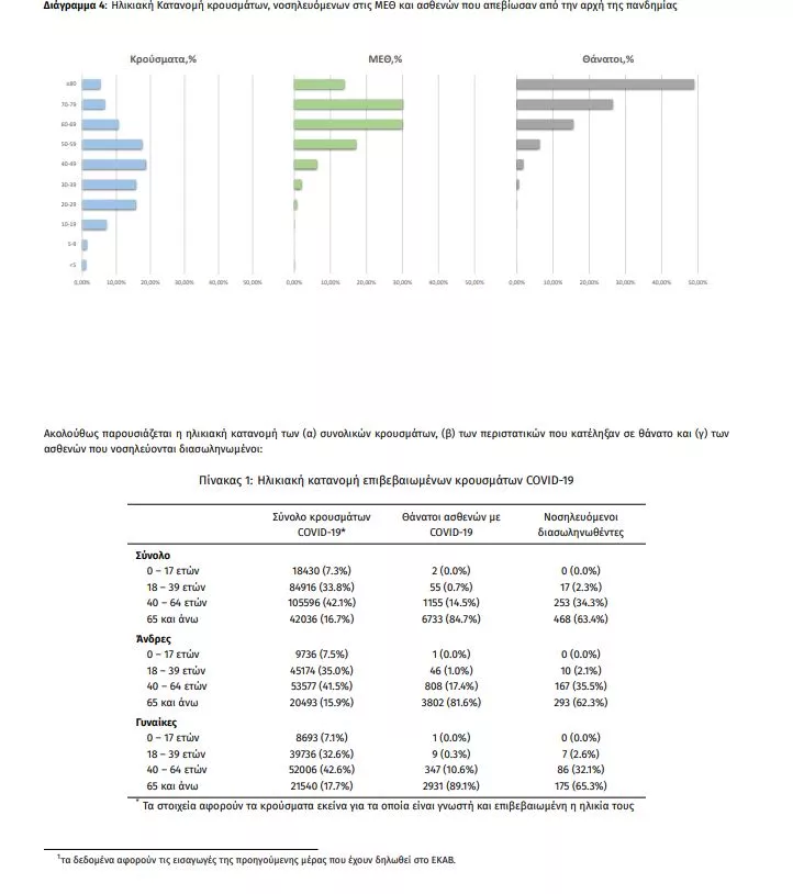 Ο αριθμός των ασθενών που νοσηλεύονται διασωληνωμένοι είναι 738 (63.6% άνδρες). Η διάμεση ηλικία τους είναι 68 έτη. To 82.5% έχει υποκείμενο νόσημα ή/και ηλικία 70 ετών και άνω. Από την αρχή της πανδημίας έχουν εξέλθει από τις ΜΕΘ 1.677 ασθενείς. Οι εισαγωγές1 νέων ασθενών Covid-19 στα νοσοκομεία της επικράτειας είναι 456 (ημερήσια μεταβολή +8.06%). Ο μέσος όρος εισαγωγών του επταημέρου είναι 447 ασθενείς.Η διάμεση ηλικία των κρουσμάτων είναι 44 έτη (εύρος 0.2 έως 105 έτη), ενώ η διάμεση ηλικία των θανόντων είναι 79 έτη (εύρος 0 έως