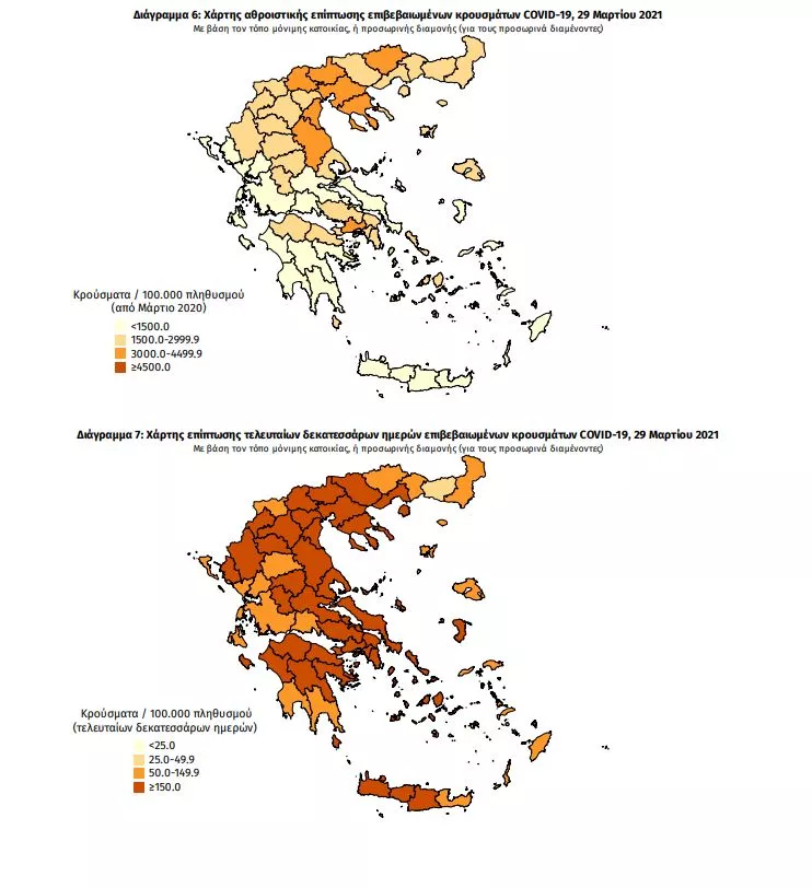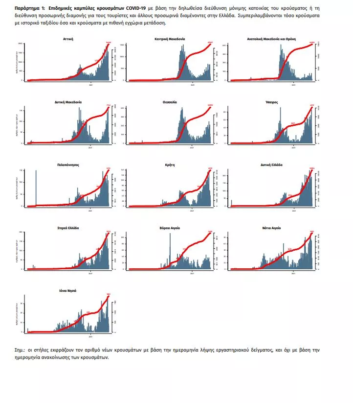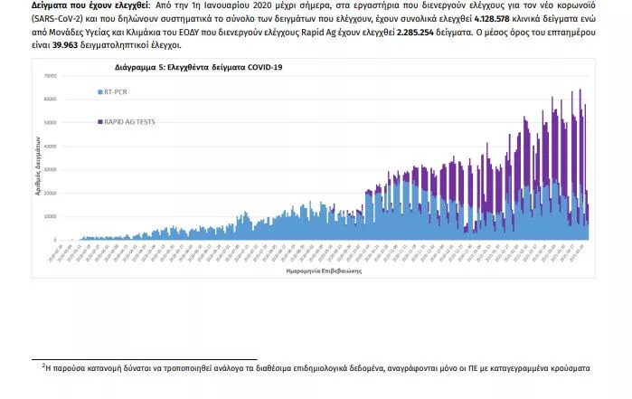 Με βάση τα επιβεβαιωμένα κρούσματα των τελευταίων 7 ημερών, 72 θεωρούνται σχετιζόμενα με ταξίδι από το εξωτερικό και 2.162 είναι σχετιζόμενα με ήδη γνωστό κρούσμα.