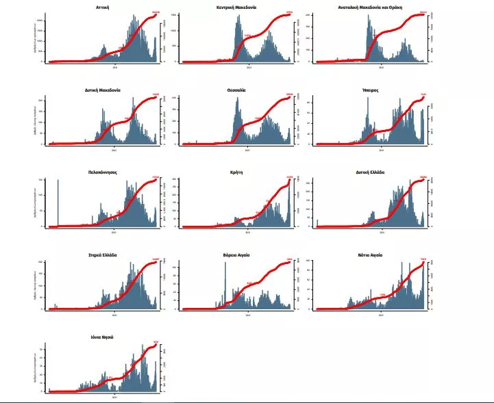 Σημ.: οι στήλες εκφράζουν τον αριθμό νέων κρουσμάτων με βάση την ημερομηνία λήψης εργαστηριακού δείγματος, και όχι με βάση την ημερομηνία ανακοίνωσης των κρουσμάτων.