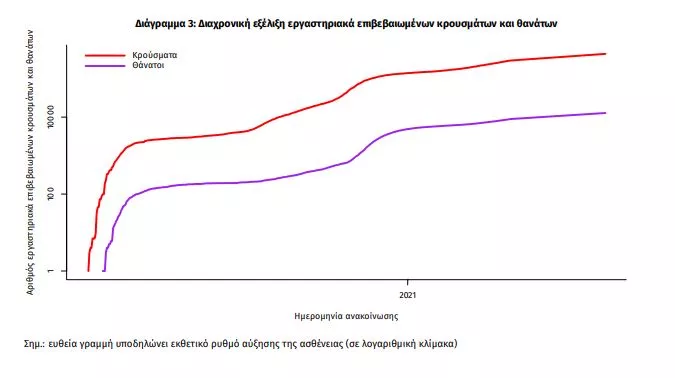 Η διαχρονική εξέλιξη των συνολικών κρουσμάτων και συνολικού αριθμού των θανάτων ασθενών COVID-19 παρουσιάζεται στο ακόλουθο διάγραμμα.