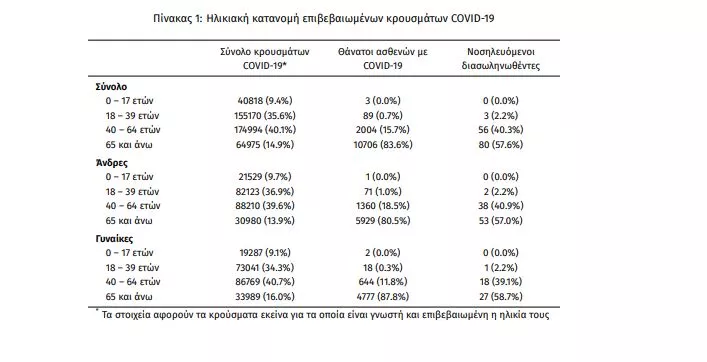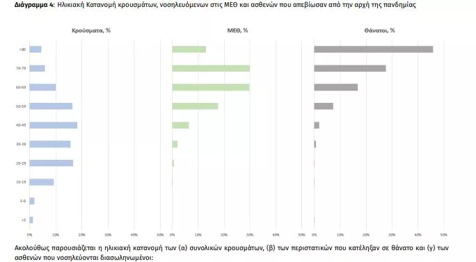 Ο αριθμός των ασθενών που νοσηλεύονται διασωληνωμένοι είναι 139 (66.9% άνδρες). Η διάμεση ηλικία τους είναι 66 έτη. To 85.6% έχει υποκείμενο νόσημα ή/και ηλικία 70 ετών και άνω. Από την αρχή της πανδημίας έχουν εξέλθει από τις ΜΕΘ 2.736 ασθενείς. Οι εισαγωγές2 νέων ασθενών Covid-19 στα νοσοκομεία της επικράτειας είναι 85 (ημερήσια μεταβολή +30.77%). Ο μέσος όρος εισαγωγών του επταημέρου είναι 65 ασθενείς.Η διάμεση ηλικία των κρουσμάτων είναι 42 έτη (εύρος 0.2 έως 106 έτη), ενώ η διάμεση ηλικία των θανόντων είναι 78 έτη (εύρος 0.2 έως 106 έτη).