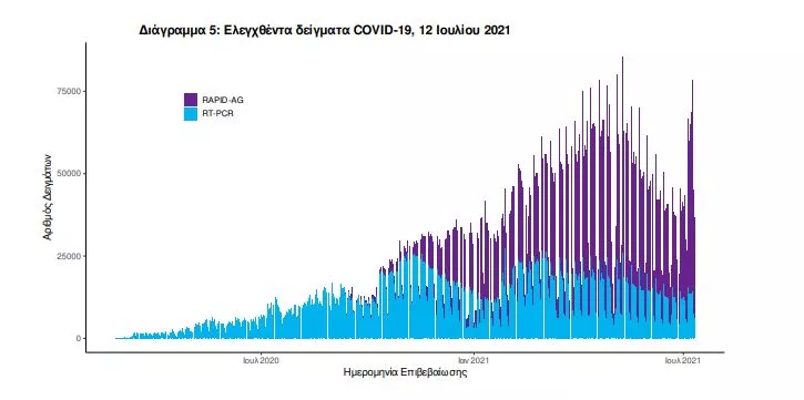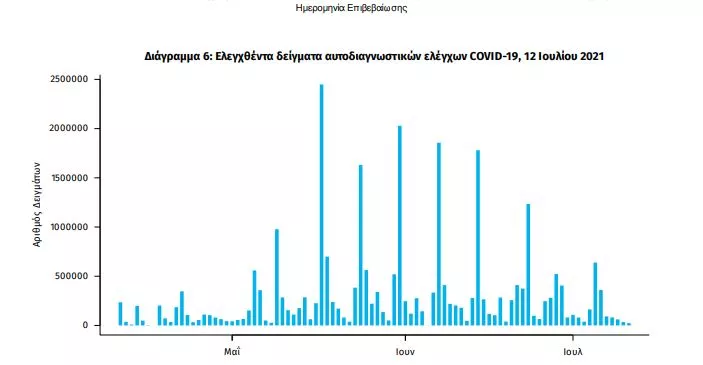 Αυτοδιαγνωστικοί έλεγχοι (Self-tests): Έως 11 Ιουλίου 2021, έχουν καταγραφεί ηλεκτρονικά 27.666.555 δηλώσεις αποτελέσματος αυτοδιαγνωστικού ελέγχου, ενώ 581.062 άτομα προσήλθαν για επανέλεγχο.
