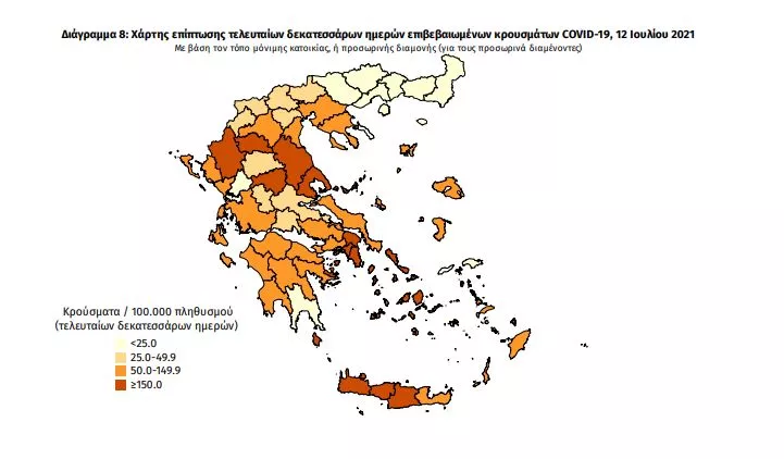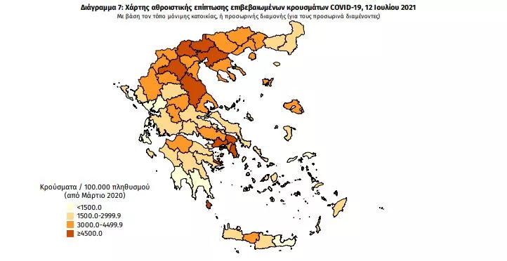 Γεωγραφική διασπορά: Ο χάρτης αποτυπώνει τη γεωγραφική κατανομή των συνολικών κρουσμάτων COVID-19 (από την αρχή της επιδημίας) ανά Περιφερειακή Ενότητα της χώρας, με βάση την δηλωθείσα διεύθυνση μόνιμης κατοικίας του ασθενούς, ή τη διεύθυνση προσωρινής διαμονής για τους τουρίστες και άλλους προσωρινά διαμένοντες στην Ελλάδα. Συμπεριλαμβάνονται τόσο κρούσματα με ιστορικό ταξιδίου (“εισαγόμενα”) όσο και κρούσματα με πιθανή εγχώρια μετάδοση
