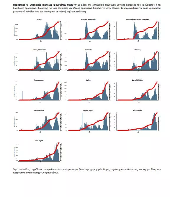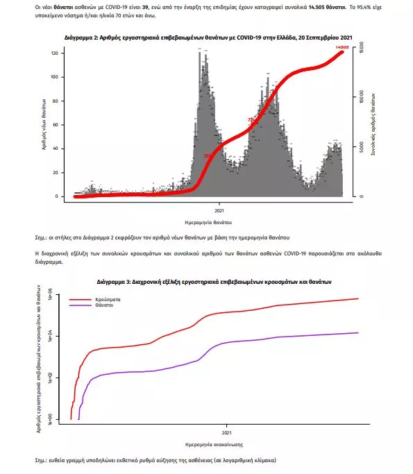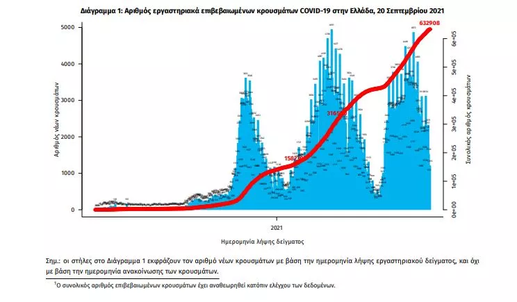 Τα στοιχεία που παρουσιάζονται αφορούν περιστατικά από την επιδημιολογική επιτήρηση της νόσου από το νέο κορωνοϊό (COVID19), με βάση τα δεδομένα που έχουν δηλωθεί στον ΕΟΔΥ και καταγραφεί μέχρι τις 20 Σεπτεμβρίου 2021 (ώρα 15:00). Τα νέα εργαστηριακά επιβεβαιωμένα κρούσματα της νόσου που καταγράφηκαν τις τελευταίες 24 ώρες είναι 2.126 , εκ των οποίων 11 εντοπίστηκαν κατόπιν ελέγχων στις πύλες εισόδου της χώρας. Ο συνολικός αριθμός των κρουσμάτων ανέρχεται σε 632.908 (ημερήσια μεταβολή +0.3%), εκ των οποίων 51.0% άνδρες. 1 Με βάση τα επιβεβαιωμένα κρούσματα των τελευταίων 7 ημερών, 138 θεωρούνται σχετιζόμενα με ταξίδι από το εξωτερικό και 2.866 είναι σχετιζόμενα με ήδη γνωστό κρούσμα. Ημερήσια εξέλιξη της πανδημίας: Η ημερήσια κατανομή των επιβεβαιωμένων κρουσμάτων είναι η ακόλουθη (η γραμμή παριστάνει την συνολική, αθροιστική κατανομή των κρουσμάτων).