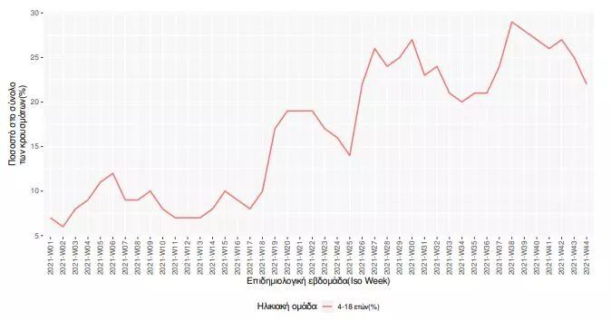 Ο αριθμός αυτός αντιστοιχεί στο 22% των συνολικών κρουσμάτων, μειωμένος κατά 12% συγκριτικά με την προηγούμενη εβδομάδα.