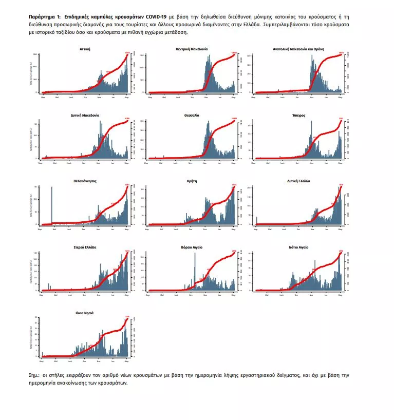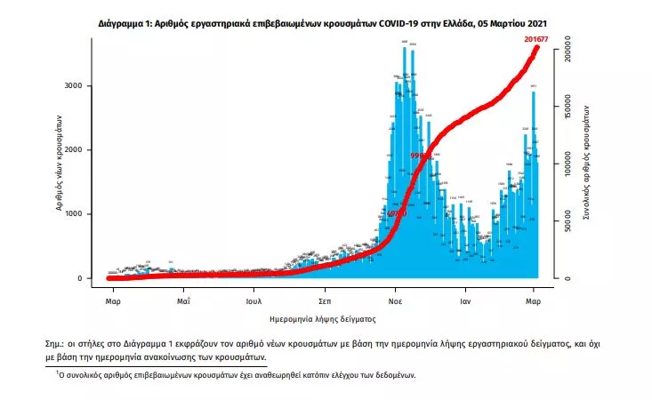 Τα νέα εργαστηριακά επιβεβαιωμένα κρούσματα της νόσου που καταγράφηκαν τις τελευταίες 24 ώρες από τον ΕΟΔΥ είναι 2215. Εκ των οποίων 15 εντοπίστηκαν κατόπιν ελέγχων στις πύλες εισόδου της χώρας. Ο συνολικός αριθμός των κρουσμάτων ανέρχεται σε 201.677 (ημερήσια μεταβολή +1.1%), εκ των οποίων 51.7% άνδρες. Με βάση τα επιβεβαιωμένα κρούσματα των τελευταίων 7 ημερών, 71 θεωρούνται σχετιζόμενα με ταξίδι από το εξωτερικό και 2.885 είναι σχετιζόμενα με ήδη γνωστό κρούσμα. Ημερήσια εξέλιξη της πανδημίας: Η ημερήσια κατανομή των επιβεβαιωμένων κρουσμάτων είναι η ακόλουθη (η γραμμή παριστάνει την συνολική, αθροιστική κατανομή των κρουσμάτων).