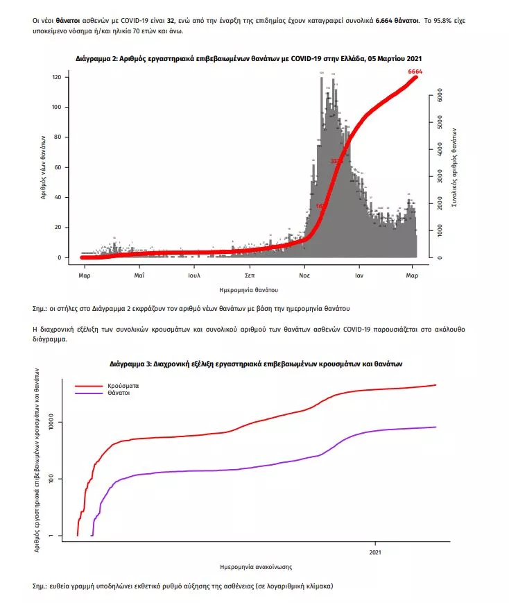 Οι νέοι θάνατοι ασθενών με COVID-19 είναι 32, ενώ από την έναρξη της επιδημίας έχουν καταγραφεί συνολικά 6.664 θάνατοι. Το 95.8% είχε υποκείμενο νόσημα ή/και ηλικία 70 ετών και άνω.