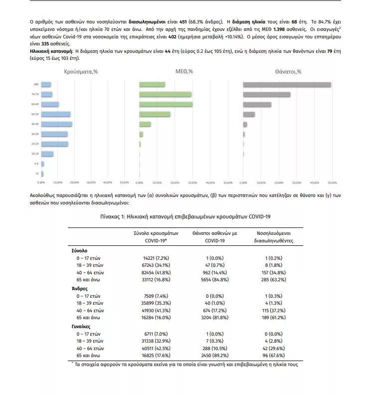 Ο αριθμός των ασθενών που νοσηλεύονται διασωληνωμένοι είναι 451 (68.3% άνδρες). Η διάμεση ηλικία τους είναι 68 έτη. To 84.7% έχει υποκείμενο νόσημα ή/και ηλικία 70 ετών και άνω. Από την αρχή της πανδημίας έχουν εξέλθει από τις ΜΕΘ 1.398 ασθενείς. Οι εισαγωγές νέων ασθενών Covid-19 στα νοσοκομεία της επικράτειας είναι 402 (ημερήσια μεταβολή +10.14%). Ο μέσος όρος εισαγωγών του επταημέρου είναι 335 ασθενείς.